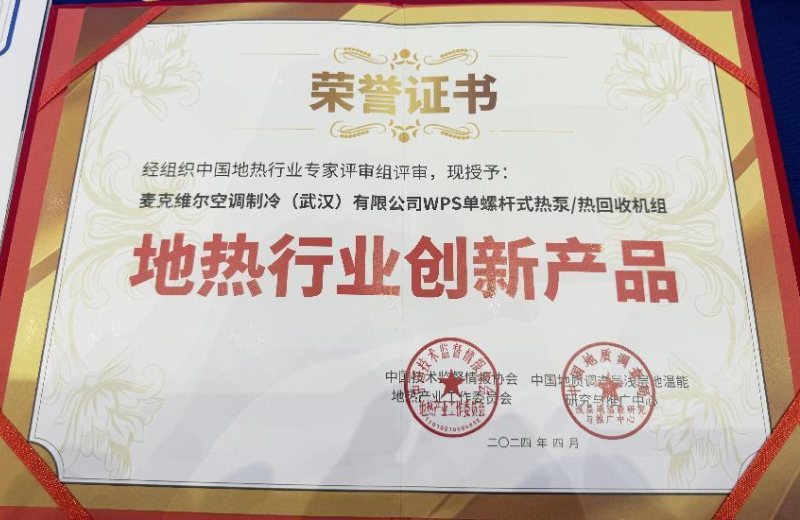 麥克維爾空調(diào)制冷(武漢)有限公司W(wǎng)PS單螺桿式熱泵/熱回收機(jī)組獲評(píng)“地?zé)嵝袠I(yè)創(chuàng)新產(chǎn)品”。