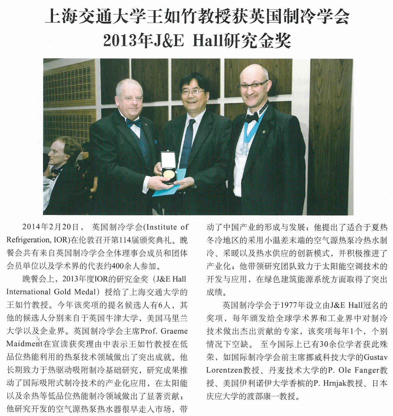 2014年2月20日,英國制冷學(xué)會(Institute of Refrigeration,簡稱IOR) 第114屆頒獎會在倫敦舉辦。英國制冷學(xué)會全體理事會成員、團體會員單位和學(xué)術(shù)界代表等400余人出席了此次會議,會上頒發(fā)了2013年度J&E Hall研究金牌。上海交通大學(xué)機械與動力工程學(xué)院王如竹教授從來自英國牛津大學(xué)、美國馬里蘭大學(xué)和企業(yè)界的6位提名人中脫穎而出,最終獲得此項殊榮。