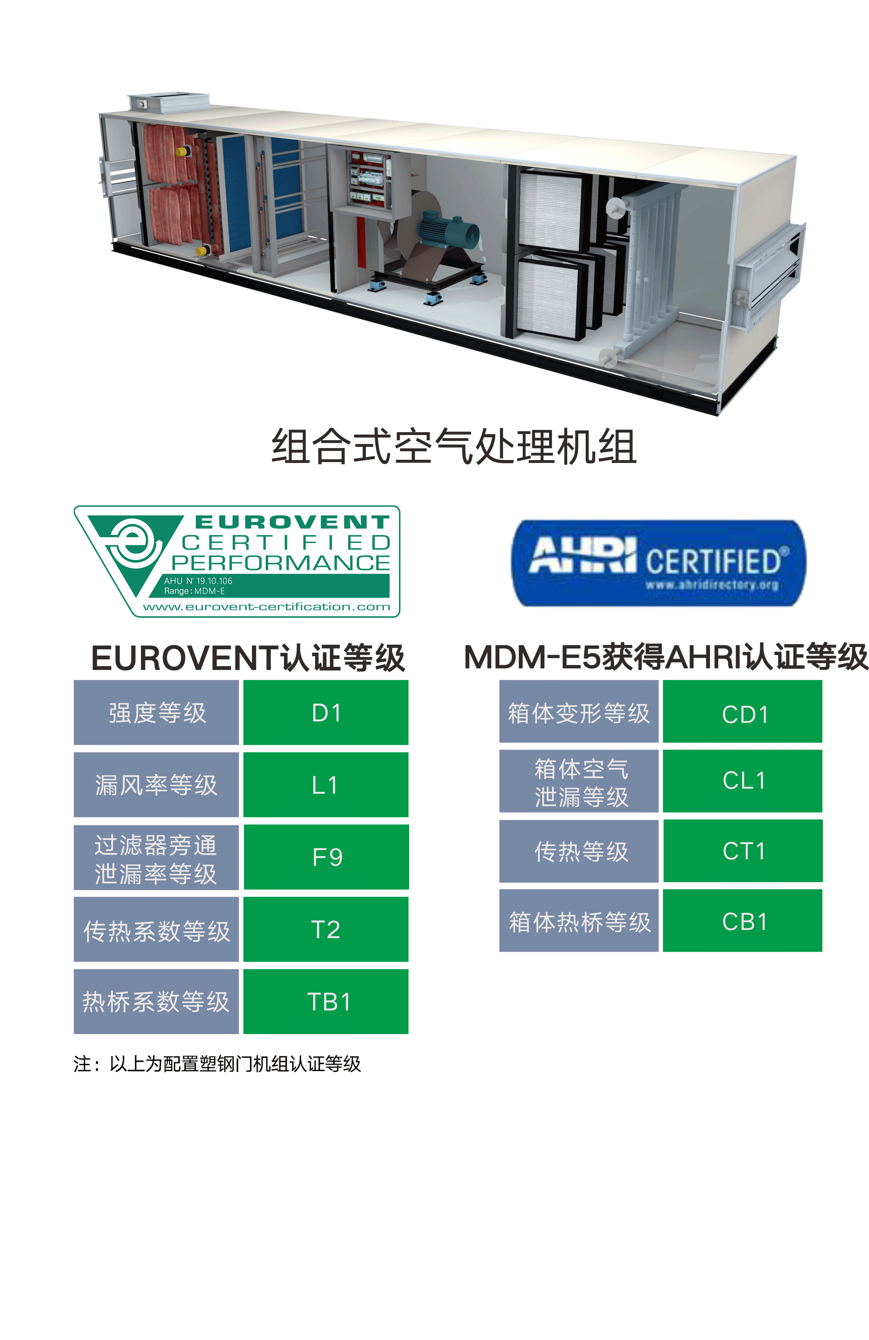 ■機(jī)組箱體獲得歐洲A級空調(diào)認(rèn)證EUROVENT認(rèn)證,同時MDM-E5機(jī)組通過美國AHRI認(rèn)證。